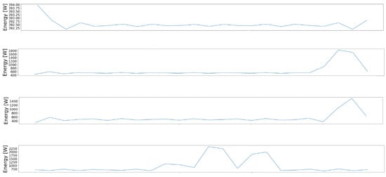 To obtain the total household energy consumption signal, we apply Equation (3). This step consists of adding the energy consumption signals obtained for each individual appliance. In Figure 4, we show the evolution of the individual energy consumption and the result of the data fusion in the same time period. In the upper part of the figure, the energy consumption for each device that is considered in the experimental setup is presented. Aligning on the exact time (the same day represented), the resulting total energy consumption is presented at the bottom of the figure (light blue). For both representations, on the OX axis is the time, and on the OY axis is the energy.
