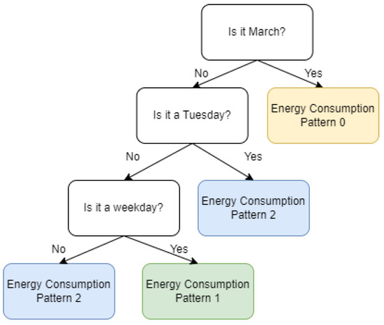 From the perspective of applicability, the discovered usage patterns can be integrated into the control flow described in Figure 1. Based on the discovered daily patterns, the Control Manager component from the referenced high-level pipeline (Figure 1) can associate a pattern with its placement in time. This is an entire research topic that deserves special attention. In [44], we present an unsupervised method that uses an explainable AI component to discover when a certain pattern occurs in time. The methodology can be extended to the energy consumption patterns extracted with the current approach. This will lead to extracted information that will provide an explanation for a pattern’s occurrence. A symbolic representation of time-dependent rules governing the occurrence of certain energy consumption patterns is presented in Figure 6.