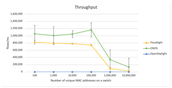 - Throughput vs. the number of unique MAC addresses in a switch—it was shown that the best results were obtained for ONOS and that throughput did not change significantly when the number of unique MAC addresses in the switch was between 100 and 100,000, for both ONOS and Floodlight.