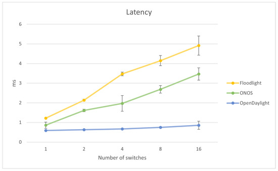 Figure 3 shows the relation between the latency and the number of switches in a range from 1 to 16. OpenDaylight provides the lowest latency. Its values are approximately constant, which leads to the conclusion that they do not depend on the number of switches. The shape of the graphs for the Floodlight and ONOS switches is close to a linear function when increasing the number of switches. Floodlight achieved the highest latency values of those three compared controllers.