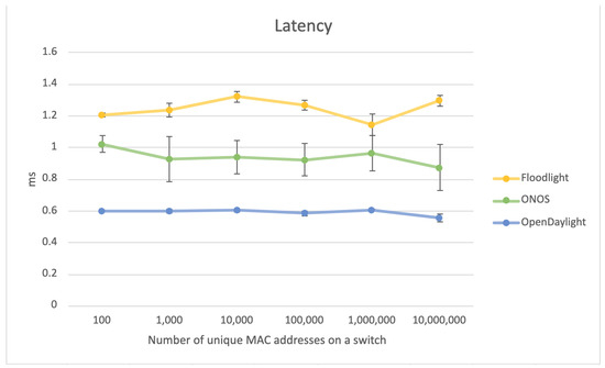It can be observed in Figure 4 that there is no specific relation between latency and the number of unique MAC addresses in the switch. Considering the measurement uncertainties visible as error bars in the graph, the function describing this relation can be compared to a linear function with a constant value. The lowest latency is achieved by OpenDaylight, while the highest by Floodlight. It can be concluded that the latency does not depend on the number of unique MAC addresses on the switch.