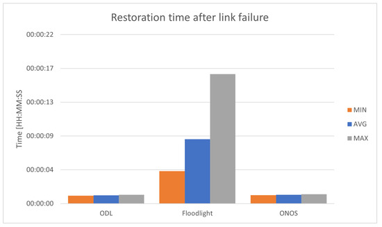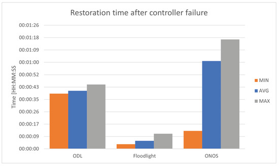 The majority of restoration time is the time it takes the controller to reboot. It also includes a significantly smaller amount of time from the time instant when the controller switches back on to the time instant when connectivity between devices on the network is restored. The results shown in Figure 6 contain the sum of both time periods. ONOS needs a very long time to start up, with an average of one minute and a maximum of one minute and 16 s, which is due to the fact that it is the most advanced controller and needs the longest time to load its functionalities. OpenDaylight obtained better results than ONOS, achieving a minimum of 38 s and a maximum of 44 s. Floodlight performed best, having the restoration time of, on average, 5 s and a maximum of 10 s.