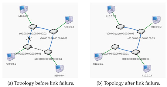 To measure restoration time after a link failure, a script written in Python using the Mininet API was used. A network consisting of four switches was constructed, with one host connected to each switch (Figure 7). Additionally, a backup link was added between the two unconnected switches.