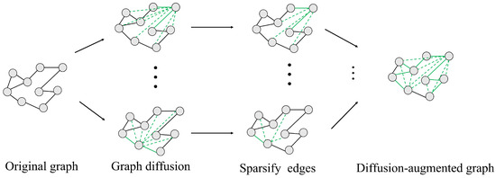 Figure 2 shows a diffusion-augmented graph in the improvement module. The graph diffusion improvement is employed to aggregate additional global information via global probability transfer, effectively addressing the over-smoothing challenge [8] and integrating long-distance neighborhood data by facilitating propagation throughout the graph.