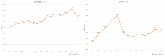 Impact of damping factor on GIA model performance on EN-DE-15K (left) and D-W-15K (right).