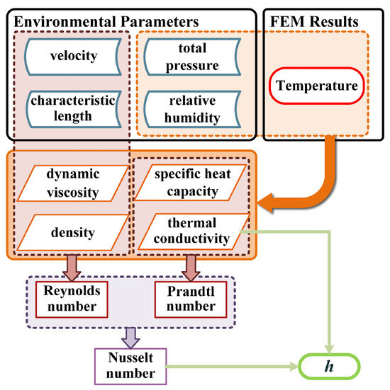 This figure depicts that only basic environmental parameters such as the flow rate, relative humidity, atmospheric pressure, and initial temperature of humid air need to be known to calculate the key thermal physical parameters of the fluid and ultimately obtain the convective heat transfer coefficient. In this paper, the electrical–thermal coupling primarily manifests in the influence of circuit operation on chip structure temperature and the effect of temperature variations on material conductivity. Therefore, the value of temperature T is the object of the finite element solution. The following provides a detailed derivation and calculation of the equivalent convective heat transfer coefficient h.