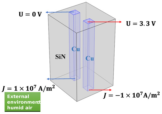 Assume that there is a 6 × 6 × 10 rectangle made of SiN with two copper conductor rods embedded, the sizes of which are both 1 × 1 × 10 . The external environment is a fluid field composed of humid air. The flow direction of the humid air is perpendicular to the side of the rectangular body, sweeping across the geometry, as shown in Figure 2. Voltage sources are added to the upper surfaces of the copper conductor rods, while volume current density flows into the rods from the bottom, working as the current source excitation. For the left copper conductor, the upper surface voltage is 0, and the normal current density is 1 × 107 . For the other, the upper surface voltage is 3.3 , and the normal current density is −1 × 107 . The copper and SiN parameters are listed in Table 2: