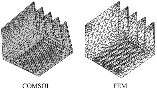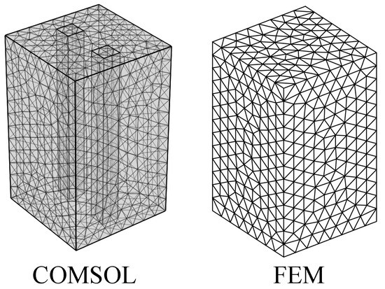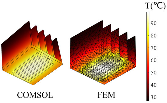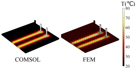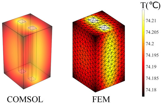 In this example, the characteristics of the fluid field were set as follows: the relative humidity was 50%, the atmospheric pressure was one standard atmospheric pressure (101,325 ), and the external temperature was 66.85 °C. The initial temperature of the rectangular structure was 26.85 °C. The meshed used in FEM and Comsol are depicted in Figure 3, and the temperature distributions obtained from the coupling calculation of the electric–thermal–fluid field and COMSOL are shown in Figure 4.