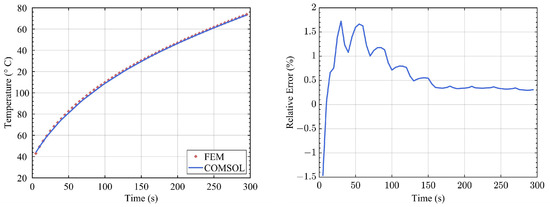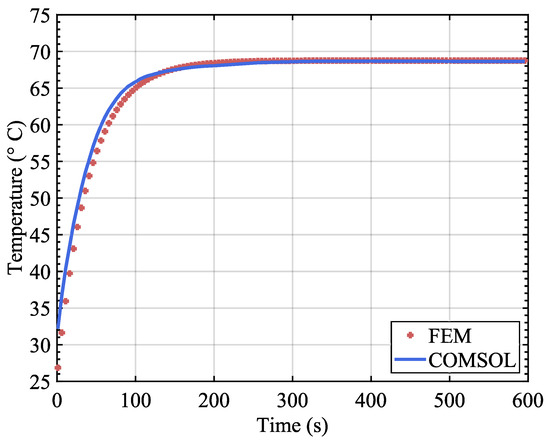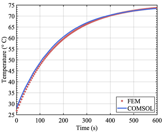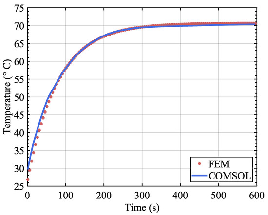In general, the results of the FEM solver and COMSOL are identical. In order to compare the calculation errors more accurately, we laid a domain point probe inside the cuboid and observed the temperature change over the simulation time. The curves are drawn in Figure 5.