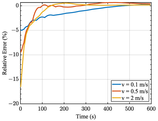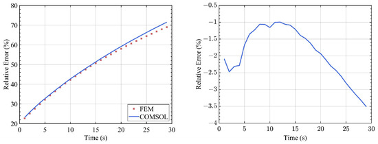 With the increase in the flow rate, as can be seen from the curves above, the time cost for the device to reach the steady-state temperature is lower. The rising trend and steady-state values of the temperature calculated with the FEM solver are consistent with those from COMSOL, except for slight differences in the initial stage. The relative error curve in Figure 8 also provides a powerful proof.