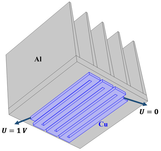 In the previous model, the conductors were completely wrapped inside the SiN, and thus the internal heat dissipation was constrained by SiN. To demonstrate the algorithm’s general applicability, two more models with various cooling methods and diverse geometric structures provide a comprehensive evaluation of our algorithm’s effectiveness. In this section, we discuss a heat sink with five fins and an electrically heated rail in contact with its bottom, as shown in Figure 9. Its geometric parameters are indicated in Figure 10. In this case, the heat sink is made of aluminum with a side length of 0.5 , and the rail is still made of copper. The two ends of the rail are excited with different voltages, as identified in the figure. The parameters of the fluid field were set as follows: the relative humidity was 50 %, the fluid velocity was 1 , the atmospheric pressure was one standard atmospheric pressure (101,325 ), and the external temperature and initial temperature of the model are both 26.85 °C.