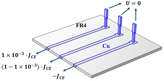 The last case to be simulated had a more elaborate structure. It was composed of a nonconductive FR4 substrate and conductive metal, including three pins of a power transistor and a conductive layer embedded in the substrate. The structure and boundary conditions are clearly indicated in Figure 14; notably, here is 3 × 107 . The geometric parameters of this case are highlighted in Figure 15.