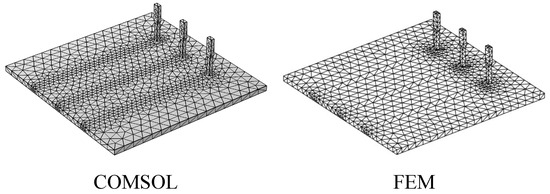 Similarly, the pins here are still made of copper, while the substrate is almost nonconductive and adiabatic. The external temperature and initial temperature of the model are both 20.85 °C, while the other environmental parameters are the same as those in the five-finned heat sink with a serpentine rail. The different meshes used in FEM and Comsol are presented in Figure 16. The temperature distributions from FEM and COMSOL for the pins and the substrate are presented in Figure 17. The temperature curve and relative error curve of a probe inside the structure are illustrated in Figure 18. The results indicate that the proposed algorithm is applicable to various structures involving coupled electrical–thermal–humid-air phenomena, and could provide accurate and reliable predictions for trends in temperature distribution and increases.