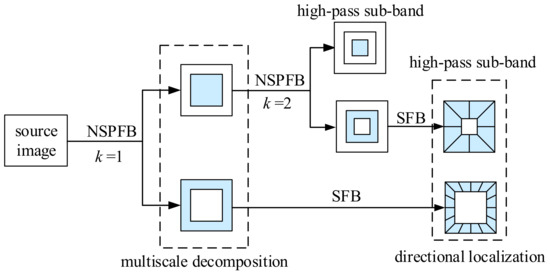 NSST maps the pseudo-polar coordinate system to the Cartesian coordinate system and demonstrates through Fourier inverse transformation that its operation can be achieved via two-dimensional convolution, thus avoiding down-sampling operations. NSST consists of two main components [16]: the Non-Subsampled Pyramid Filter Banks (NSPFB) and Shift-Invariant Shearlet Filter Banks (SFB). The NSST process (Figure 2) unfolds as follows: initially, the NSPFB conducts a multiscale decomposition of the source image at level k, yielding a single low-pass sub-band and k high-pass sub-bands; subsequently, the SFB applies a directional transformation at level j to the high-pass sub-bands, yielding 2j high-pass components. This effectively achieves a multidirectional decomposition of the high-pass sub-bands.