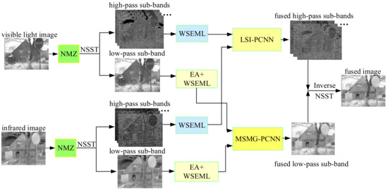 This paper integrates the multiscale transformation algorithm NSST with PCNN, leveraging their spatial and spectral information advantages. The method optimizes the parameter settings of the PCNN model and spatial correlation and designs fusion strategies for the high-frequency and low-frequency sub-bands obtained from the NSST decomposition to enhance energy preservation and detail-extraction capabilities. The fusion method proposed in this paper is illustrated in Figure 3, with the following workflow: