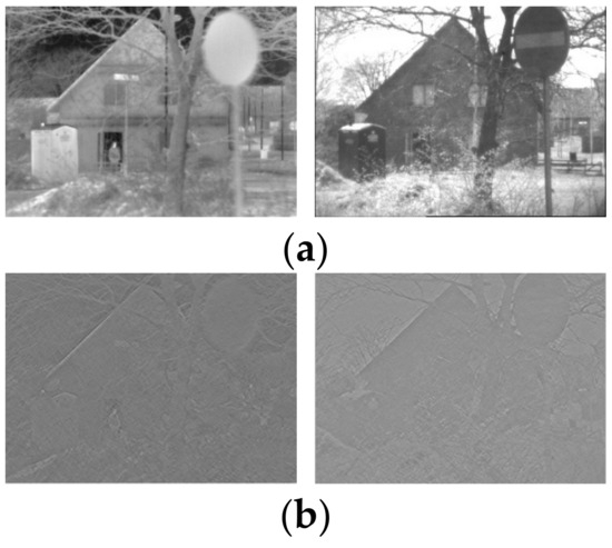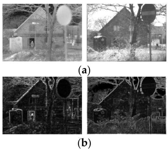Regional singular values represent the main features and variation trends of a local area, capturing the primary directions and intensity changes of the pixels within that region. Therefore, the regional singular values of an image reflect the structural characteristics and energy information within the local area. If the regional singular values of the image are replaced with an identity diagonal matrix, these characteristic details are removed, resulting in the loss of the image’s details and textures. As shown in Figure 4, the infrared and visible light source images in Figure 4a are decomposed using regional singular value decomposition and then replaced with an identity diagonal matrix, resulting in Figure 4b. Compared to Figure 4a, the two images in Figure 4b lose their original structure and local area features, becoming blurred and flattened.