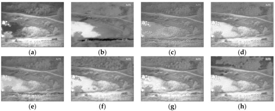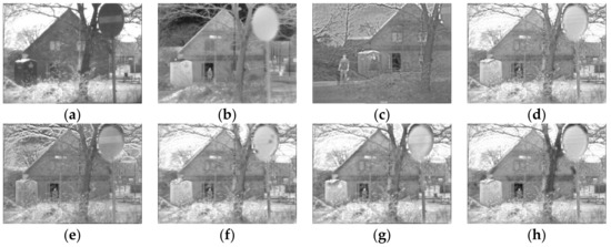 The fusion results obtained by applying NSST, NSST-DCPCNN, VSM-WLS, NSCT-PAUDPCNN, NSST-PAPCNN, and the proposed algorithm to four sets of source images are illustrated inFigure 6a–h, Figure 7a–h, Figure 8a–h and Figure 9a–h, respectively.