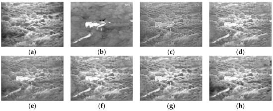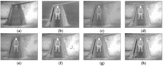 The fourth group of original images and six fused images; (a) Visible light image; (b) Infrared image; (c) NSST; (d) NSST-DCPCNN; (e) VSM-WLS; (f) NSST-PAPCNN; (g) NSCT-PAUDPCNN; (h) Proposed.