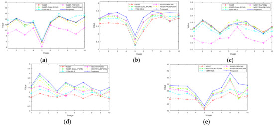 Comparison of objective evaluation metrics for the ten sets; (a) SF; (b) IE; (c) QAB/F; (d) MI; (e) SD.