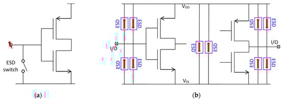 - Pan, Z.; Li, C.; Hao, W.; Li, X.; Wang, A. ESD Protection Designs: Topical Overview and Perspective. IEEE Trans. Device Mater. Reliab. 2022, 22, 356–370. [Google Scholar] [CrossRef]
