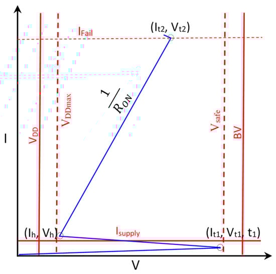 Performance, reliability, and costs are the three core attributes for any IC. While high performance and dense integration are the true beauty of CMOS ICs, low-cost manufacturing makes chips affordable, leading to the huge success of ICs with massive societal impacts. On the other hand, it is excellent reliability that makes chips a wide-spread commodity today. ESD failure is one of the most devastating IC reliability problems, which causes USD billions of losses annually, substantially affecting the microelectronics industry, which has a revenue of USD ~600 billion (USD ~1123 billion expected for 2033) [35,36]. On-chip ESD protection is hence required for all ICs, echoing the industry saying: “No chip can be sold without ESD protection”. Fundamentally, the ESD phenomenon occurs when two objects of different potentials are brought within touching distance (or in close proximity). The static charges stored inside will exchange in between, generating very fast, very strong voltage (up to 10 s of kV) and current (up to 10 s of A) pulses that can readily damage ICs [37,38]. ESD protection uses a controlled switch device connected at a pad-on-chip, as depicted in Figure 2a, which stays OFF during normal IC operations and will be turned ON by an incoming ESD pulse to form a low-R conduction path to discharge the ESD transient into the ground (GND) [38]. Typically, a complex ESD protection network is needed on a chip to handle random ESD stressing on any pads and deal with different ESD zapping polarities, as illustrated in Figure 2b. An ESD protection device is typically characterized by a set of ESD-Critical Parameters describing its ESD discharging behaviors, which include ESD triggering voltage, current, and time (Vt1, It1, and t1); holding voltage and current (Vh, Ih); discharging resistance (RON); and thermal breakdown voltage and current (Vt2, It1). These ESD-critical parameters must be carefully designed for any ESD protection structures to ensure compliance with the ESD Design Window, i.e., confined within the window as depicted in Figure 3 [32,39]. ESD protection structures inevitably introduce parasitic effects, including capacitance (CESD), leakage current (Ileak), and noises and noise coupling, which affect IC performance. Additionally, ESD protection structures are large; therefore, they will consume the Si die area and make the chip layout difficult. These unwanted features are collectively called ESD Design Overhead Effects and can seriously affect ICs; hence, a major ESD design challenge is how to minimize ESD design overhead effects [40]. Hard ESD failures include thermal damages (i.e., hot spots) induced by large current pulses and voltage breakdown caused by high electric field density. It is noteworthy that microelectronics system products generally require comprehensive ESD protection at all chip, module (packaging), and system (PCB) levels to handle random failures and prevent high system costs.