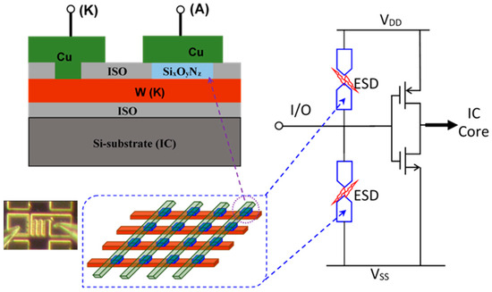 - Wang, L.; Wang, X.; Shi, Z.; Ma, R.; Liu, J.; Dong, Z.; Zhang, C.; Lin, L.; Zhao, H.; Zhang, L.; et al. Dual-Directional Nano Crossbar Array ESD Protection Structures. IEEE Electron Device Lett. 2013, 34, 111–113. [Google Scholar] [CrossRef]