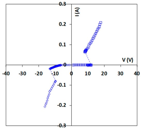 TLP measurement for a prototype nano crossbar ESD switch device (1 μm × 1 μm), showing symmetric ESD discharging I–V characteristics [44].