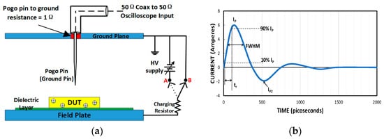 FICDM ESD testing schematic (a) and CDM ESD pulse waveform (b).