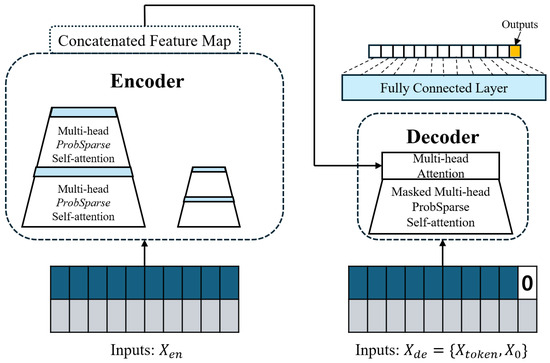- ProbSparse Self-Attention: The self-attention mechanism of the existing Transformer model exhibits the limitation of high computational complexity and memory usage in proportion to the input sequence length. To solve these problems, ProbSparse Self-Attention was introduced in the Informer model. This increases the computational and memory efficiencies by selectively performing the calculations for only the most important queries, which are identified with a high probability:where Q is the query matrix, K the key matrix, V the value matrix, the sparse matrix (same size as Q,) and d the dimension of the key vectors.