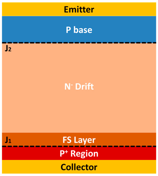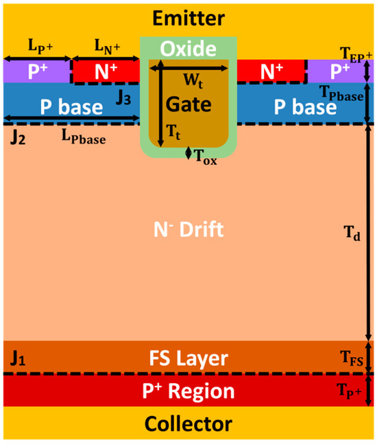 Figure 1 shows the cell structure of 650 V trench FS-IGBT. Specifically, the three p/n junctions of the FS-IGBT are labeled J1, J2, and J3. The N-drift region, with a doping concentration of 1 × 1014 cm−3 and a thickness of 62 μm, is designed to withstand a breakdown voltage exceeding 650 V. Additionally, the gate oxide has a thickness of 0.12 μm, while the gate trench measures 5 μm in depth and 1 μm in width. The other parameters are listed in Table 1.