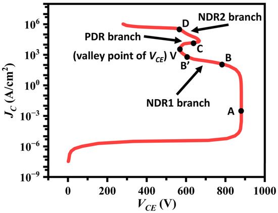 The blocking behavior of the FS-IGBT can be equated to that of a PNP transistor with an open base. As shown in Figure 2, when avalanche breakdown occurs and the avalanche current increases, the first NDR branch (NDR1 branch) emerges on the avalanche breakdown curve. This is followed by the appearance of a Positive Differential Resistance (PDR) branch. Finally, the second NDR branch (NDR2 branch) appears.