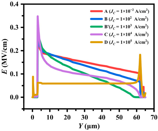 With a further increase in JC, the FS-IGBT transitions from the PDR branch to the NDR2 branch. This transition is attributed to the occurrence of the Egawa electric field, which produces a high electric field at both ends of the device, creating a mutually reinforcing bilateral avalanche effect. This effect is illustrated in the electric field distribution at point D in Figure 3 [16,22]. This branch forms through the same mechanism as the NDR branch in the power diode.