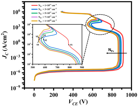 A comparison of simulated avalanche breakdown characteristic curves for five FS-IGBTs with different collector doping concentrations of NP+ is shown in Figure 4. As the NP+ concentration in the FS-IGBT increases, the αpnp at the same JC becomes larger, resulting in a lower VCE at this JC value. Furthermore, with increasing NP+, the valley point V corresponds to a higher JC value. Figure 5 shows the variation in αpnp with collector current density JC for five FS-IGBTs operating in avalanche breakdown mode, as extracted by simulation. As JC increases from the level of leakage current, the FS layer transitions from low to high injection, resulting in a gradual increase in Lp,eff and αpnp, as noted in Equation (3). When JC is increased sufficiently to inject a substantial number of carriers into the FS layer, the hole injection efficiency γp at junction J1 decreases significantly, leading to a sharp decrease in αpnp. This explains why the avalanche breakdown curve of the FS-IGBT transitions from the NDR1 branch to the PDR branch. From Figure 5, it is also evident that as NP+ increases, the JC corresponding to the sharp decrease in αpnp also increases. This occurs because for γp to decrease as NP+ increases, the density of holes injected into the FS layer must increase; consequently, JC must also increase. In summary, the larger the αpnp of the FS-IGBT, the stronger the negative differential resistance (NDR1) effect, and the higher the JC value corresponding to the valley point V of VCE.
