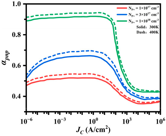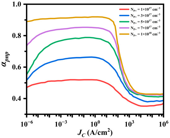 The αpnp for the 650 V FS-IGBT with different NP+s as a function of JC.