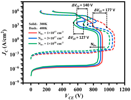 As JC increases, the density of holes injected into the FS layer also increases, surpassing the background doping concentration of the FS layer. Consequently, the FS layer shifts from a low-level to a high-level injection state, leading to an increase in Lp,eff, which is limited by the bipolar diffusion coefficient La,FS in the FS layer. As a result, the αpnp increases during this process, resulting in a decrease in VCE. Meanwhile, according to Equation (3), the high hole density p injected into the N- region is large enough to affect the ND, causing the electric field gradient to steepen, thereby reducing the surrounding area and VCE.