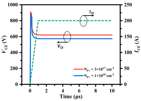 The reliability of IGBTs is affected not only by the strength of the current filament but also by its mobility [27,28]. Figure 9 shows the simulated time-dependent VCE curves for two FS-IGBTs operating in avalanche mode with NP+ = 3 × 1017 cm−3 and NP+ = 1 × 1018 cm−3 at constant temperature. ICE is the pulse current applied identically to both devices. The current density distribution inside the device is shown in Figure 10. Since the pulse current ICE = 200 A, both devices operate on the NDR1 branch of the avalanche breakdown curve shown in Figure 2, resulting in the VCE in Figure 9 reaching a peak value as ICE increases, then dropping rapidly due to the NDR effect. Due to the higher NP+ and the stronger NDR effect, the VCE at NP+ = 1 × 1018 cm−3 decreases more significantly than that at NP+ = 3 × 1017 cm−3. Observations of the current density distribution inside the device and the current filament generated by the avalanche reveal that the current filament has remained fixed at its original position since its formation and has not moved over time. This stability explains why the VCE curve shown in Figure 9 remains unchanged.