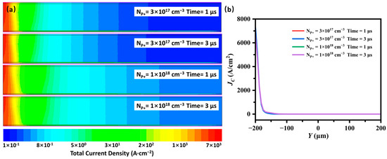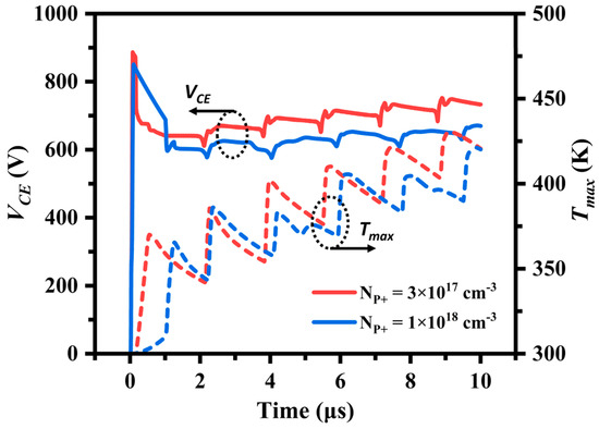 It should be noted that the lattice temperature is higher for NP+ = 1 × 1018 cm−3 during the same temperature jump cycle as shown in Figure 11. However, at NP+ = 3 × 1017 cm−3, the current filament moves to the device boundary and then shifts in the opposite direction. Consequently, the temperature changes more frequently, resulting in higher maximum lattice temperatures Tmax for the device at NP+ = 3 × 1017 cm−3 than for NP+ = 1 × 1018 cm−3 during specific intervals. This discrepancy can be attributed to the limitations of device simulation [32,33], given that real devices consist of thousands of cells. The movement of a current filament from one boundary of the device to another takes considerable time, and multiple current filaments may be generated. Therefore, the maximum lattice temperature Tmax of NP+ = 1 × 1018 cm−3 is expected to be higher than that of NP+ = 3 × 1017 cm−3 in real devices.