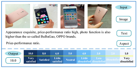 Multimodal aspect sentiment classification (MASC) is a subtask of multimodal aspect sentiment analysis that aims to classify the sentiment of a particular aspect, where an aspect refers to a word or phrase that describes any attribute related to an entity [1]. Nowadays, e-commerce platforms have many consumer reviews, which are very important for customers who are about to purchase goods. Categorizing consumer reviews through MASC enables customers to swiftly gain insights into various product aspects without the labor of manually evaluating each aspect on online retail sites. As shown in Figure 1, for text-image pairs that contain aspects of price–performance ratio, our inputs are text information, image information related to the text, and aspect information for a particular aspect. Our output is the result of classifying the emotional polarity of a particular aspect. We categorized the outputs into eight categories based on the level of satisfaction of the consumers and used eight different scores to indicate the different categories. A higher score means that consumers are more satisfied with an aspect of the product and a lower score means that consumers are less satisfied.