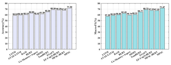 For a fair comparison, we followed the experimental parameter settings in [29]. The number of the hops in the text memory network is 3, which is the optimal hop count in previous experiments. The dimension of the hidden representation of LSTM is 100. The maximal padding length of the text content is 320, and the maximal padding length of the aspect words is 4. For the images, we resized them to 224 × 224 and fed them into a pre-trained neural network ResNet152 [38] to extract 2048 × 7 × 7 dimensional embeddings. The maximum fill number of M is 5. The dropout is 0.2, the learning rate is 0.001, the batch size is 128, and the early stopping is 10; during the training process, it can monitor the performance on the validation set. Once performance begins to decline, training will stop to avoid overfitting. This method helps to find the optimal point for training time to achieve optimal generalization performance. In addition, we chose the cross-entropy loss function and updated the parameters using the Adam optimizer.