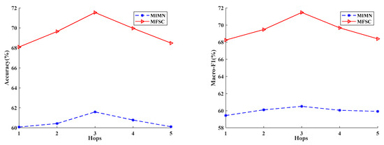 MFSC uses a memory network-based method for extracting text features. Therefore, the number of memory hops is a major hyperparameter that affects the performance. Referring to the MIMN [29], we show the experimental results of MFSC with 1 to 5 memory hops and compare them; the results are shown in Figure 5. When the number of the memory hop is 1, this leads to its worst results due to its inability to adequately learn the interaction of text and aspect features. The performance of MFSC becomes better as the number of memory hops increases, and it reaches its best performance when the memory hop is 3. However, when the memory hop is more than 3, the performance of MFSC does not become better; this is because it has higher complexity and lower generalization with the increase in the number of memory hops.