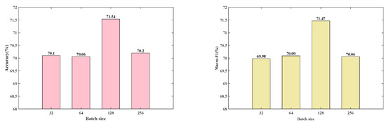 In this section, the effect of batch sizes on the experimental results is tested, where batch sizes denote the number of data samples captured in a training session. The size of the batch sizes affects the model training; larger batch sizes yield more precise gradient estimates but can cause memory issues, slow convergence, and reduced generalization. And smaller batch sizes can lead to a better generalization error, but it will bring noise and even lead to non-convergence. Therefore, the choice of batch sizes is also an important issue. The results of the variation of accuracy and macro-F1 values under different sizes of batch sizes are shown in Figure 6, and we can see that MFAC works better when the batch size is 128.