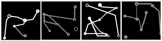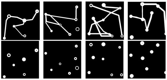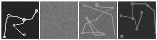To generate images resembling X-ray projections, we employed a straightforward technique of sketching images on a digital canvas. For simulating PCB X-ray images, we created 2D representations using basic shapes: disks and lines to mimic junctions and traces on PCBs. This involved assembling composite geometries with hollow circles of various sizes, randomly positioned to represent PCB junctions, and lines interconnecting these circles, symbolizing PCB traces. Each geometry was converted into a synthetic image by assigning intensity values, chosen randomly from a predefined range, to both the circles and lines. Figure 1 illustrates several examples of these generated images before any noise addition.