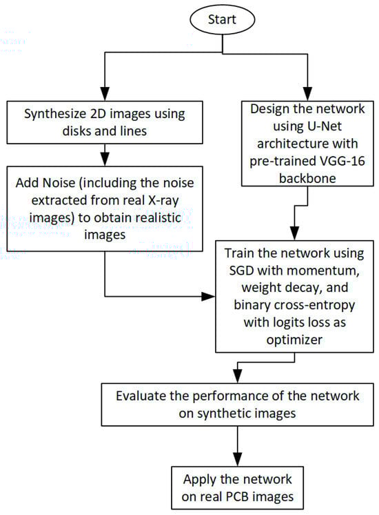 As the optimizer, we employed stochastic gradient descent with momentum, which helps accelerate convergence and escape local minima by considering the past gradients, and weight decay to prevent overfitting by penalizing large weights. We used a decaying learning rate to fine-tune the learning process, starting with a higher learning rate that gradually decreases, allowing for more precise updates to the weights as training progresses. Also, we utilized binary cross-entropy with logits loss as the loss function, which is well-suited for binary segmentation tasks and helps in effectively distinguishing the junctions and traces in the PCB X-ray images. The training of both networks was carried out using synthetic datasets.