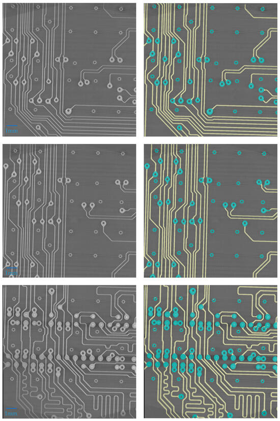 Fused segmentation results for larger PCBs. The left images are real X-ray images of PCB samples, and the right images depict the results of the trained network’s semantic segmentation. In the right images, the predicted labels—which are outputs from the network—are overlayed onto the original X-ray images. These fused images clearly demonstrate the network’s success in precisely predicting the correct labels for each pixel, resulting in highly accurate semantic segmentation.