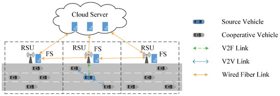 Considering a one-way linear highway environment, multiple fog servers (FS) equipped with road side units (RSU) are uniformly deployed along the roadside, as shown in Figure 1. The vehicles are moving in a straight line with constant speed. The vehicle with task offloading requirements is defined as the source vehicle, and the rest are defined as cooperative vehicles. The source vehicle can communicate directly with the fog servers through the vehicle-to-fog server (V2F) link, and the source vehicle can communicate directly with cooperative vehicles through the V2V link. The adjacent fog servers and cloud server are connected through the wired fiber link. In the system model, the source vehicle can offload the task to the local, the current fog server and the cloud server or offload the task to the adjacent fog servers through the current fog server or the cooperative vehicles.