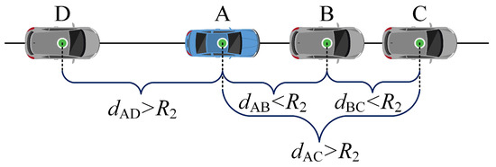 Dedicated short range communication (DSRC) technology is adopted for communication between vehicles, as shown in Figure 3. is the distance between vehicle A and vehicle B, and similarly, the distance between other vehicles is defined as , . Within the maximum communication distance between vehicles, vehicles can communicate directly with each other. When the transmission distance exceeds , and there are forwarding vehicles around, the task can be transmitted by multi-hop, otherwise it cannot be transmitted. In Figure 3, when vehicle A transmits data to vehicle C, the data can be sent to vehicle B first, then the data can be transmitted from vehicle B to vehicle C by multi-hop.