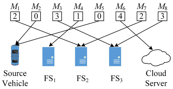 In the coding example shown in Figure 5, there are 3 available fog servers as fog nodes in the environments, and the task is divided into 8 subtasks. When the chromosome is encoded as , the tasks and are offloaded to the source vehicle, the task is offloaded to the cloud server, and the remaining tasks are offloaded to the same serial number of fog servers.