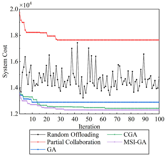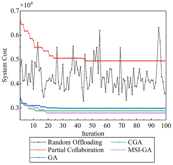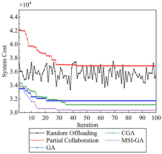 As can be seen from Figure 8, most of the system costs of the random offloading scheme are lower than the partial collaboration scheme, The system costs of the GA, CGA and MSI-GA schemes are all lower than the random offloading scheme and the partial collaboration scheme; Among the three schemes of GA, CGA and MSI-GA, the GA scheme achieves convergence earliest, but its system cost is the highest among the three schemes. The CGA scheme and MSI-GA scheme converge in a similar generation, but the system cost of the MSI-GA scheme is lower. Therefore, the proposed MSI-GA scheme is superior to the random offloading scheme, the partial collaborative scheme, the GA scheme and the CGA scheme when considering only system delay or energy consumption.