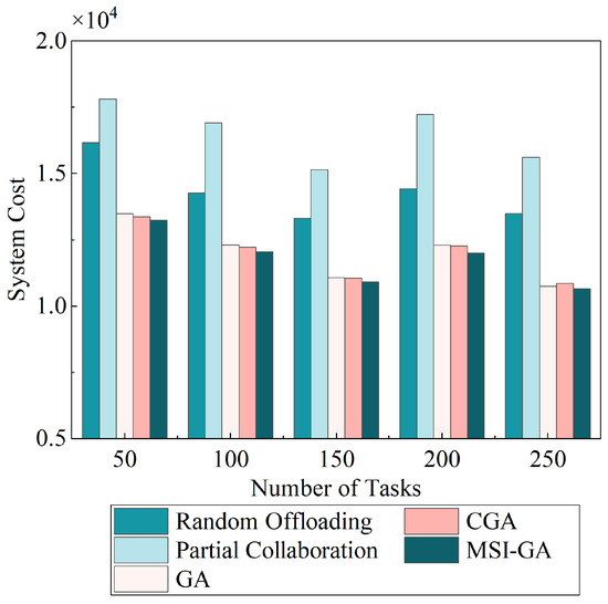 Figure 9 shows the influence of a different number of tasks on the task offloading scheme when there are five fog nodes, under balancing system delay and energy consumption. In Figure 9, the proposed MSI-GA scheme is compared with the partial collaborative scheme, the random offloading scheme, GA and CGA. From Figure 9, for the five schemes, the system cost changes steadily as the number of tasks increases, which is consistent with Equation (24). Here, when the number of tasks increases and all tasks are offloaded to the source vehicle, system delay and energy consumption increase simultaneously. Among the five schemes, the partial collaborative scheme has the highest system cost under a different task number, while the proposed MSI-GA scheme has the lowest system cost. When the number of tasks is 200, the system cost of the proposed MSI-GA scheme is reduced by approximately 20.3%, 43.67%, 2.75% and 2.34% compared with the random offloading scheme, the partial collaborative scheme, GA and CGA, respectively. This shows that the proposed MSI-GA scheme has a lower system cost than the other schemes when dealing with a different number of tasks.