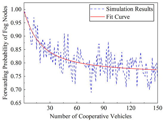 Figure 11 shows the influence of the change in the number of cooperative vehicles on the forwarding probability of fog nodes. In Figure 11, the simulation results are fitted into a fit curve adopting the logistic regression model. It can be seen from the fit curve that with the increase in the number of cooperative vehicles, the probability of fog node forwarding gradually decreases, and the decreasing trend gradually becomes more stable. After the introduction of V2V-assisted forwarding, the greater the number of vehicles around the source vehicle, the lower the probability of task forwarding through the fog nodes, and the forwarding load of the fog nodes also decreases. Without V2V-assisted forwarding, more vehicles require fog node services, posing challenges to service quality. However, after introducing V2V-assisted forwarding, all vehicles can become forwarding nodes, reducing the forwarding load for fog nodes by utilizing mutual services between vehicles and making full use of the surrounding resources.